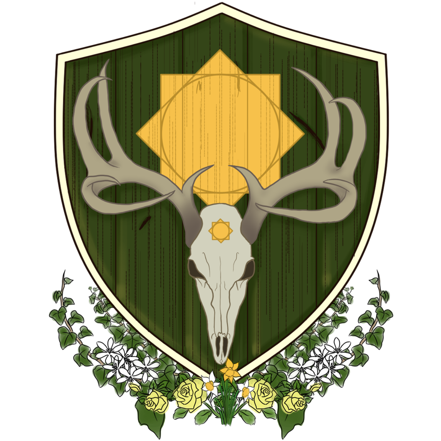 The Crest of Braitheld was inspired by the many grasslands that encompass the realm, the flowers come from the natural wild spring flowers that populate Braitheld. The centerpiece of the stag skull a representation of the bloodshed and war from the people of Braitheld and their ambition and determination to get what they want. Some also theorise the stag skull is a representation of Asmundis, however, historians have never found a definite confirmation or denial.